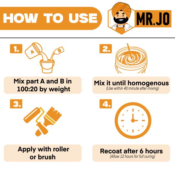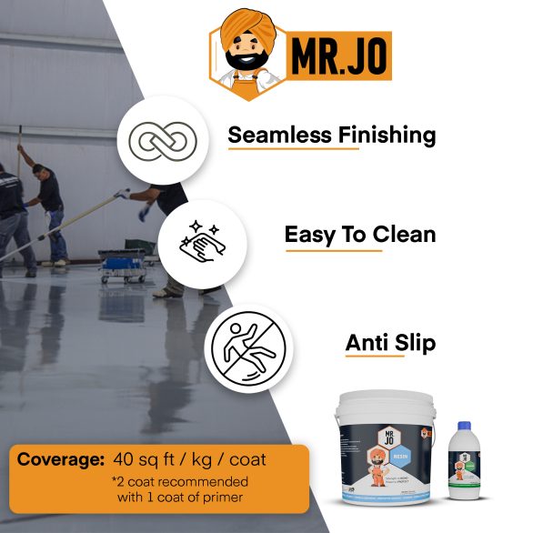 Q14. Is MR. JO Floorkot – HB anti-skid?A14. By default, it is smooth. You can broadcast quartz sand or anti-skid granules between coats to increase surface grip.