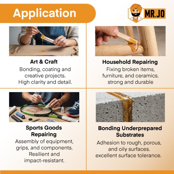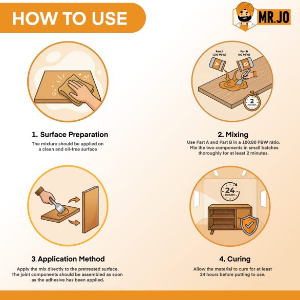 Mr. JO Tecbond – ASG is a two-part epoxy adhesive that dries fast and cures quickly. Because it contains no solvents, it works well for many uses, such as repairs, crafts, and industrial tasks. Moreover, it bonds different surfaces strongly and lasts a long time. Therefore, you can rely on it for both home and industrial projects. Additionally, its quick surface drying saves you time.in this product is food contact safe